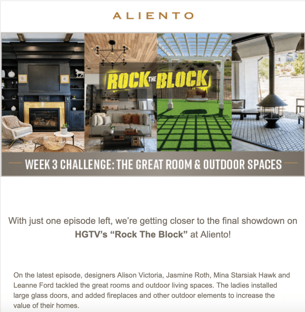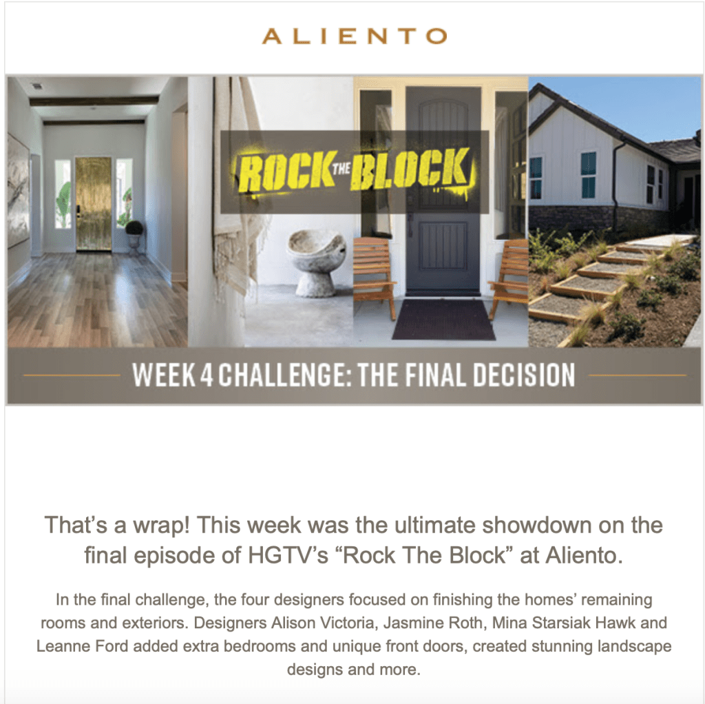Email campaign | HGTV “Rock The Block” Email campaign promoting Pardee Homes’ partnership with HGTV’s “Rock The Block” show. The premiere season in 2019 was filmed at Pardee’s master-planned community, Aliento, in Santa Clarita. Email 1 Email 2 Email 3 Email 4 March 2, 2022 0